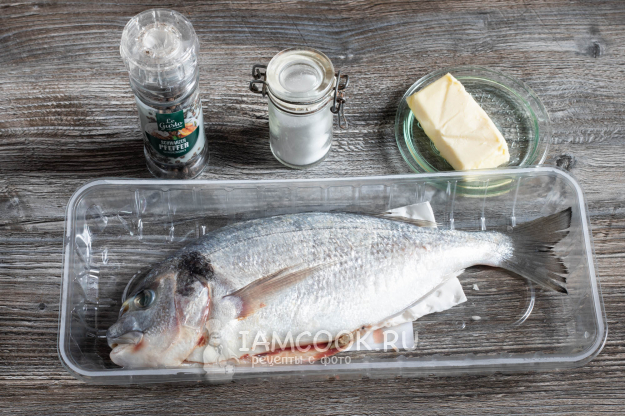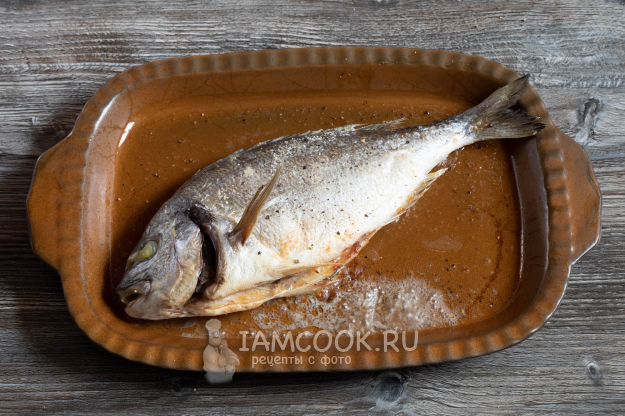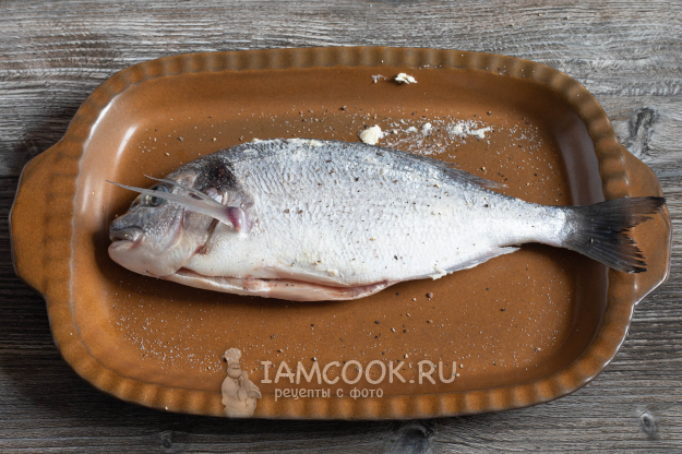 Возьмите около 10 г масла (по 5 на сторону) и натрите кожу дорадо. Посолите и поперчите по вкусу.