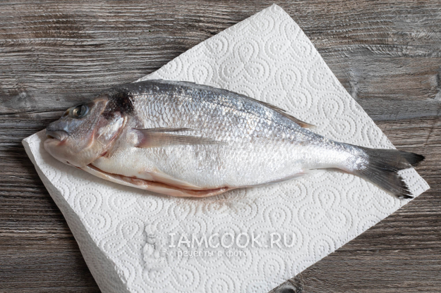 Очень тщательно очистите дорадо от чешуи. На конечном этапе протрите всю рыбу бумажным полотенцем в направлении от хвоста к голове (против чешуи). Осторожно в районе спинного плавника - там легко наколоть палец. Грудные плавники следует вывернуть и поставить торчком, потому что иначе чешую из-под них не вычистить. В принципе, при желании можно вообще удалить все плавники, но мне рыба с ними просто больше нравится на вид.