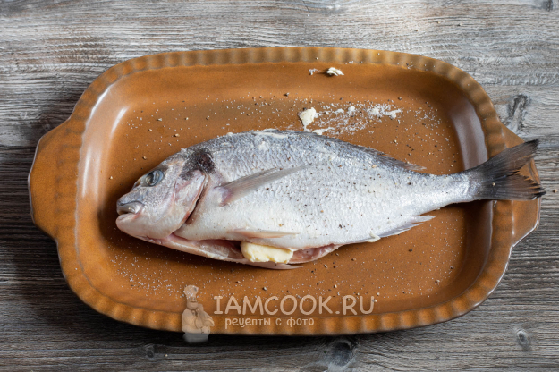 Раскройте живот дорадо, посолите и поперчите его, держа рыбу на спине, а потом положите внутрь большой кусок сливочного масла.