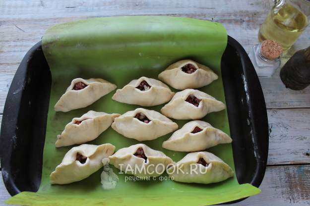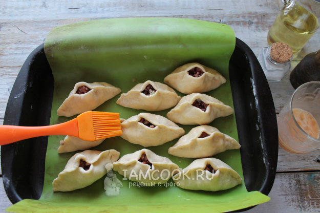 Смажьте взбитым яйцом и отправьте в духовку: я ставлю в холодную, постепенно довожу температуру до 180 градусов. По мере нагрева пирожки поднимутся.