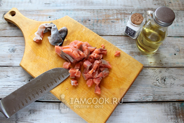 Пока тесто поднимается, приготовим начинку. Возьмите филе горбуши, снимите кожу, удалите пинцетом или с помощью ножа поперечные косточки, нарежьте мякоть кубиком 0,5-0,7 см по грани.