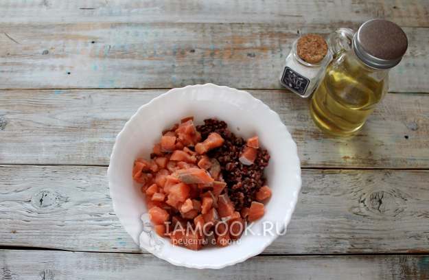Добавьте рыбу к вареному рису, у меня нынче - красный рис.