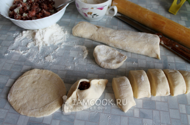 Подошедшее тесто разделите на колбаски, разрежьте поперек на кусочки примерно по 50 г. Раскатайте лепешками и положите начинку. Залепите края, оставляя в центре дырочки. Ведь у нас расстегаи - значит, расстегнутые пирожки!