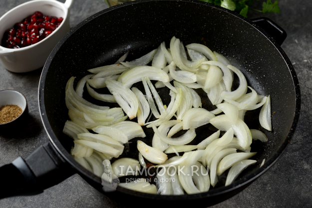 Посолите и поперчите блюдо по вкусу, всыпьте кориандр зернами или молотый, добавьте зерна граната.