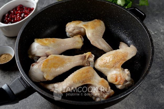 В сухую горячую сковороду выложите куски курицы кожей вниз, жарьте на тихом огне минут 10-15, до красивой румяной корочки. За это время из куриной кожи должен вытопиться жир, в котором и будет готовиться блюдо. Если этого не произошло из-за сорта курицы, тогда можно добавить немного постного рафинированного масла.