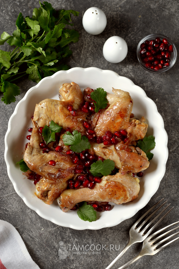 Готовое блюдо разложите по порциям, посыпьте слегка свежими зернами граната, листиками кинзы и подавайте к столу. Просто и очень вкусно!