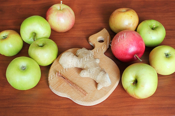 Яблоки очистите от сердцевины, нарежьте небольшими кусочками, имбирь нарежьте в виде тонкой длинной стружки (например, овощерезкой), засыпьте все сахаром, добавьте палочку корицы.