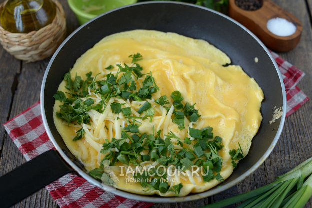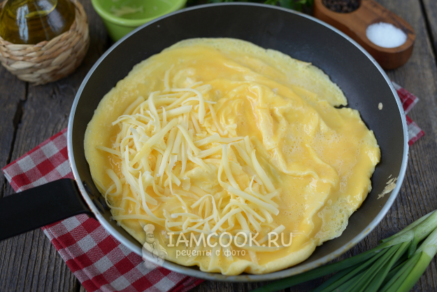 Разогрейте в сковороде немного постного масла, вылейте яичную массу. Жарьте омлет классическим способом, отодвигая готовый лопаткой к серединке. Когда только верхушка останется чуть жидковатой, посыпьте половину натертым сыром.