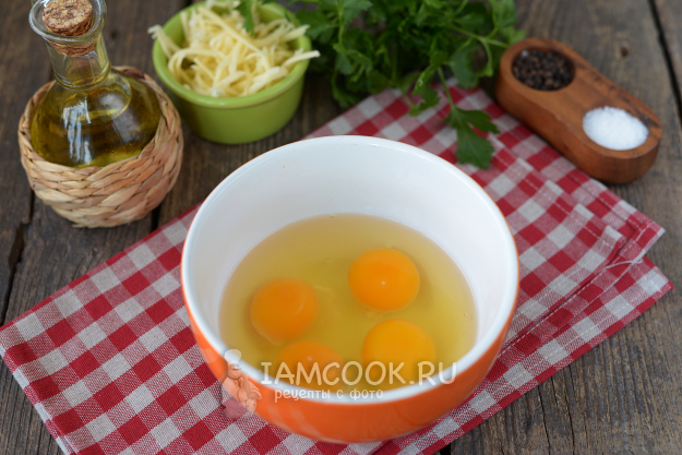 Взбейте в глубокой миске яйца. Если яйцо мелкое, тогда возьмите 4 штуки.