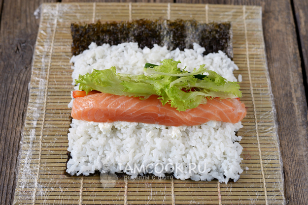 Сверху положите несколько листьев салатных листьев. Аккуратно сверните заготовку в ролл.