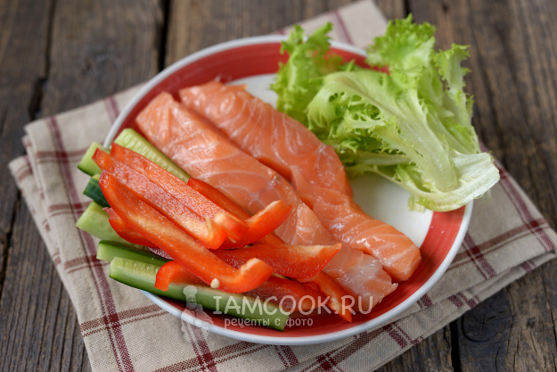 Нарежьте тонкими ломтиками огурец, перец болгарский. Рыбу разрежьте на две одинаковые части.