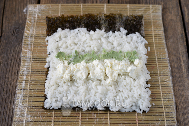 Выложите лист нори на циновку глянцевой стороной вниз, на нори положите заправленный рис. Посередине смажьте творожным сыром любимого производителя и пастой васаби при желании.