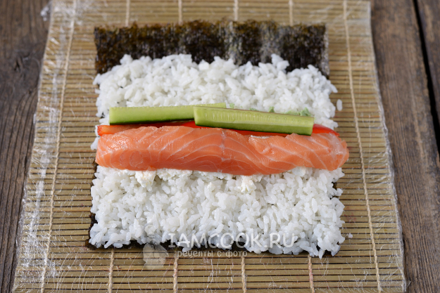 Выложите на сыр ломоть семги, пару ломтиков огурца и перца. Во многих вариантах суширитто еще кладут тонко нашинкованную морковь и помидоры. Честно говоря, даже не представляю их в этом составе.