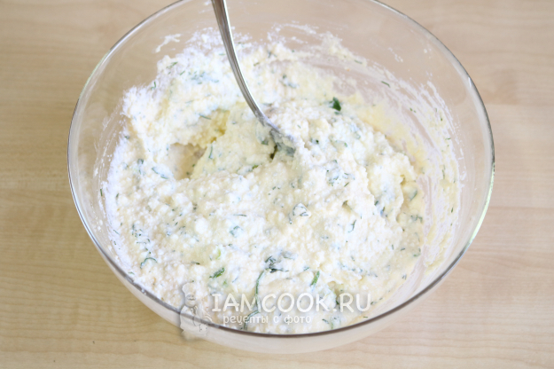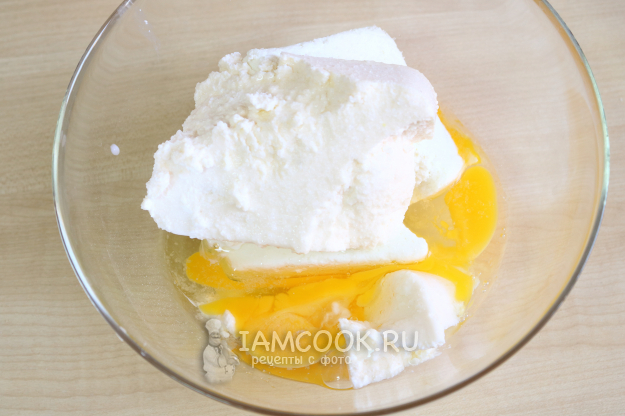 В миске соединяем творог, рикотту и яйца. Всыпаем соль по своему вкусу. Тщательно перемешиваем до однородности.