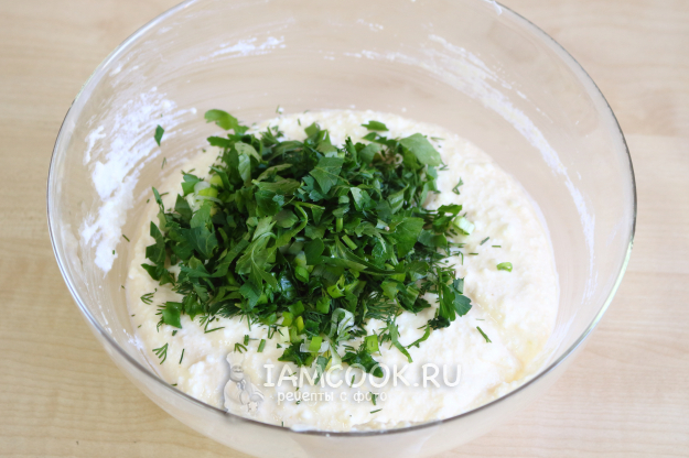 В массу добавляем также по вкусу свежую рубленую зелень. У меня - смесь укропа, петрушки и зелёного лука. Можно использовать и замороженную.