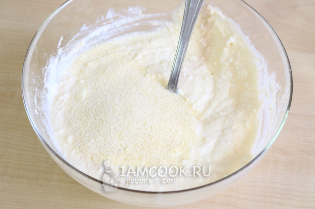 Всыпаем манную крупу. Также мешаем и оставляем в стороне на полчаса. Тем временем подготавливаем форму и разогреваем духовку.