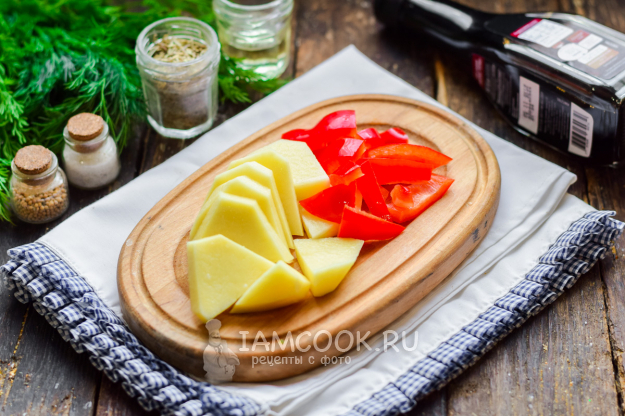 Картофель нарезать крупными брусками. Сладкий перец нарезать пластинами. Духовку прогреть, и установить температуру 180 градусов.