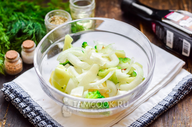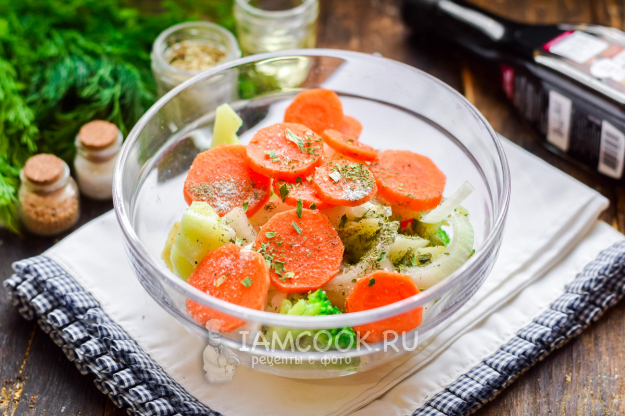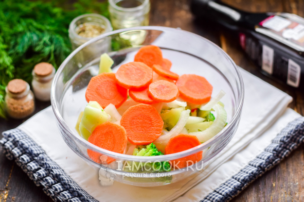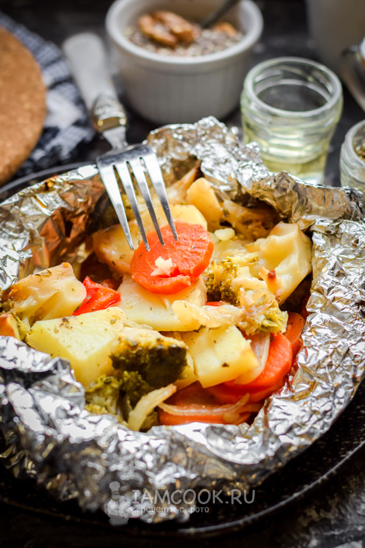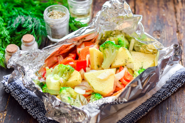 Расстелить на рабочей поверхности фольгу, сделать бортики, переложить в фольгу овощной микс.