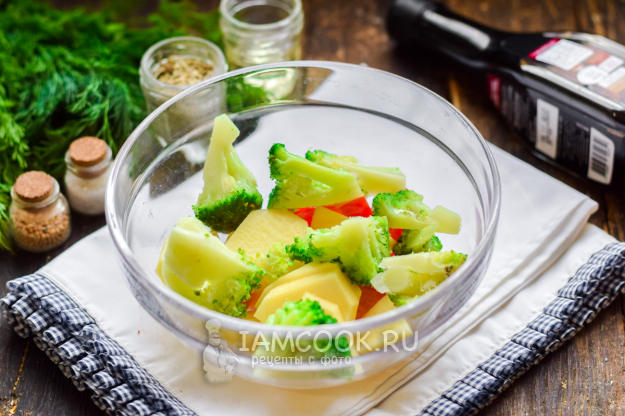 Овощи переложить в глубокую миску, добавить брокколи.