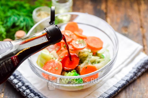 Влить следом в овощи соевый соус, хорошо перемешать все.