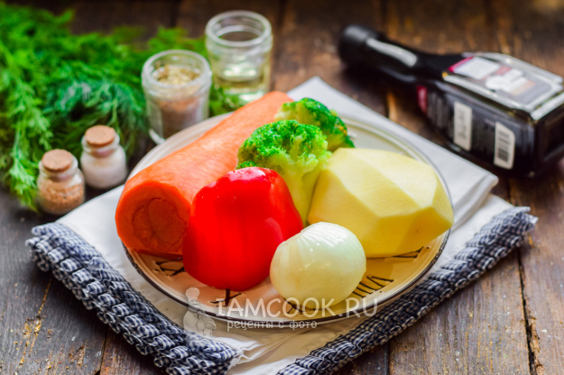 Подготовить ингредиенты для приготовления овощей в фольге в духовке в соевом соусе. Очистить картофель, морковь и лук. Брокколи можно использовать замороженное или свежее. Очистить сладкий перец.