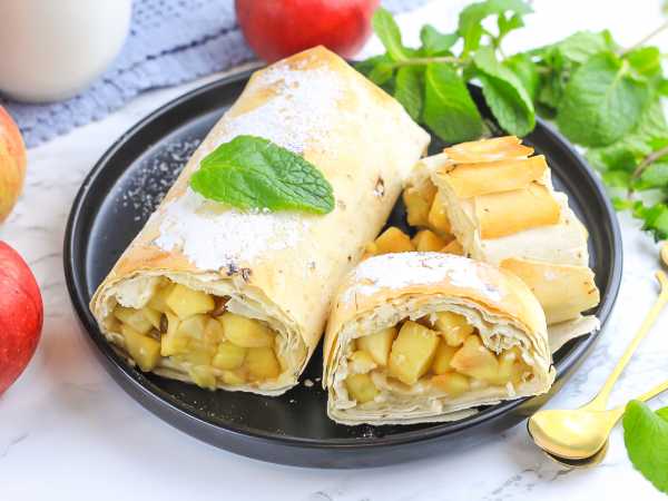 Выньте штрудель из духовки, прикройте полотенцем и оставьте до полного остывания, только потом нарезайте на порционные кусочки.