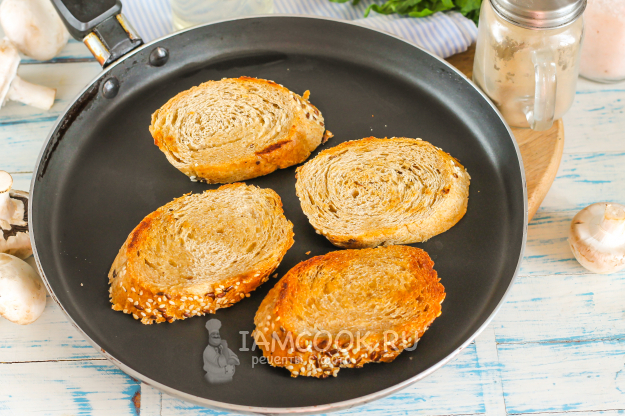 Багет нарежьте ломтиками по диагонали. Поджарьте нарезку на сковороде с обеих сторон до румяности, смазав ее растительным маслом.