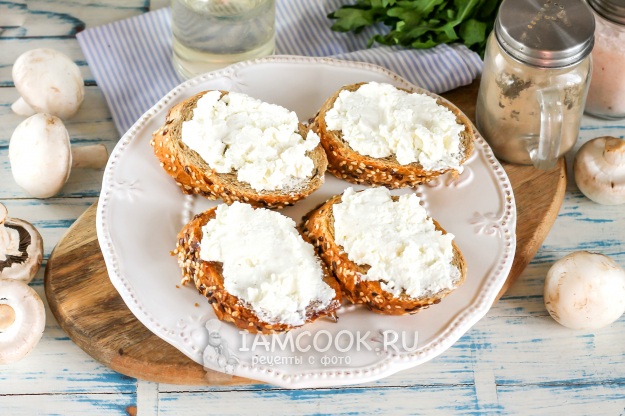 Поджаренные ломтики хлеба обмажьте творогом, посолите.