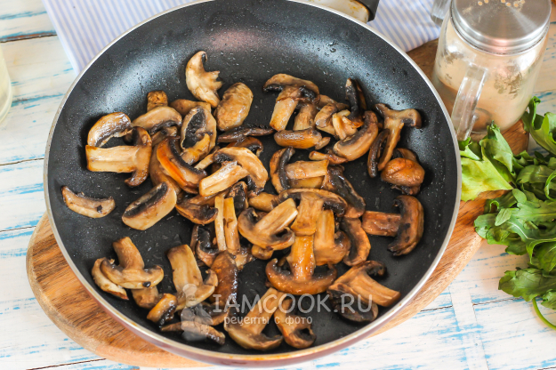 Шампиньоны промойте в воде, нарежьте слайсами и поджарьте на сковороде в оставшемся растительном масле.