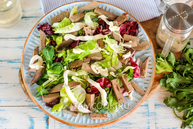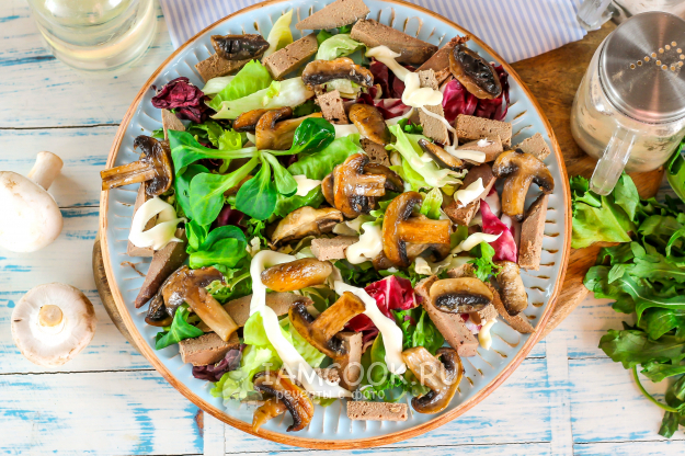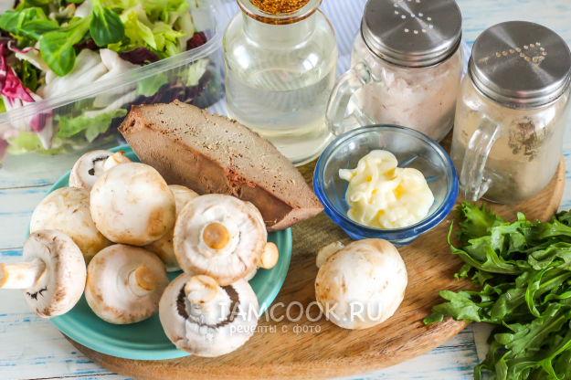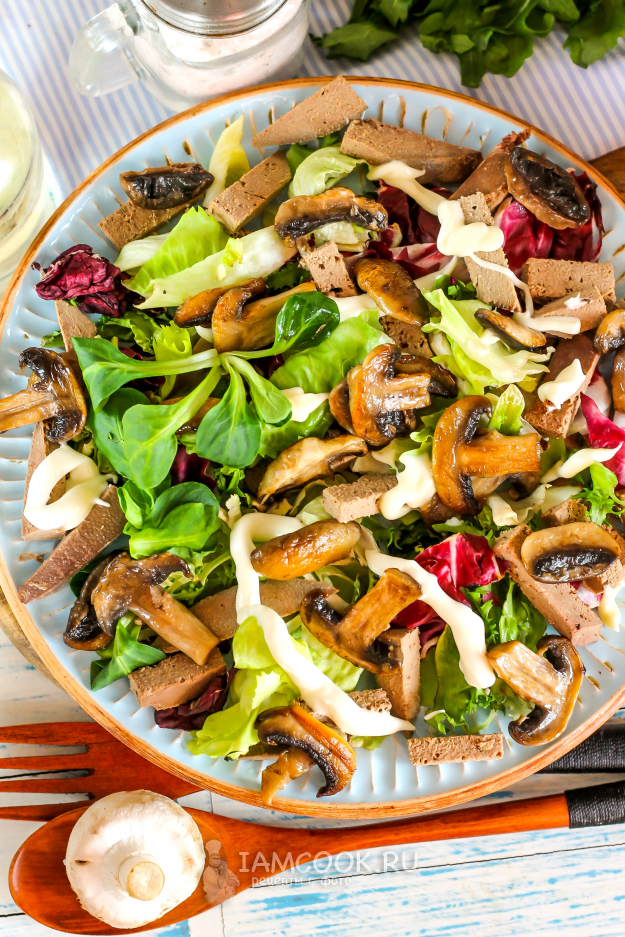 Этот сытный, но лёгкий салат можно создать из отварной свиной или куриной печени и обжаренных грибов: шампиньонов, вешенок, белых и т.д. Салат с грибами и отварной печенью не слишком калориен, но вкусен и сочен.