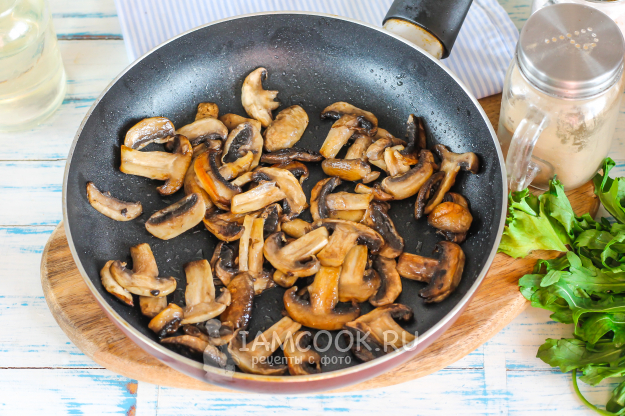 Шампиньоны можно запечь, чтобы не использовать растительное масло, либо же отварить. Салат также вкусен с маринованными или солеными грибами, но тогда количество соли необходимо будет уменьшить.