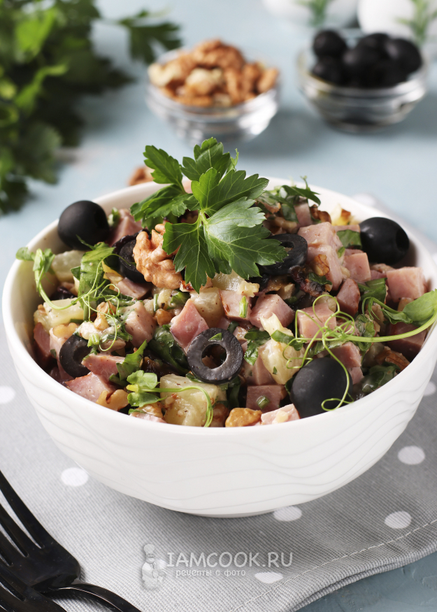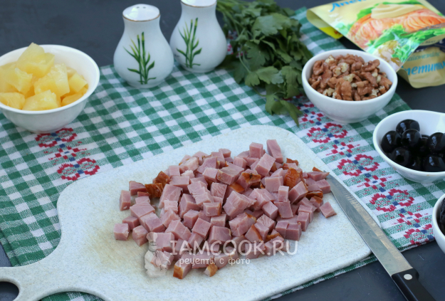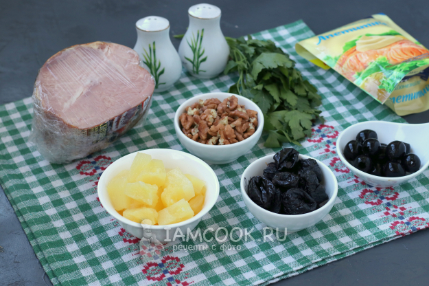 Предлагаю приготовить вкусный и сочный салат с бужениной, ананасами, черносливом и орехами. Этот салат удобен тем, что для него не нужно ничего отваривать заранее, и при наличии всех ингредиентов салат готовится очень быстро. Салат можно подать на праздничный стол или приготовить в будни к любому гарниру.