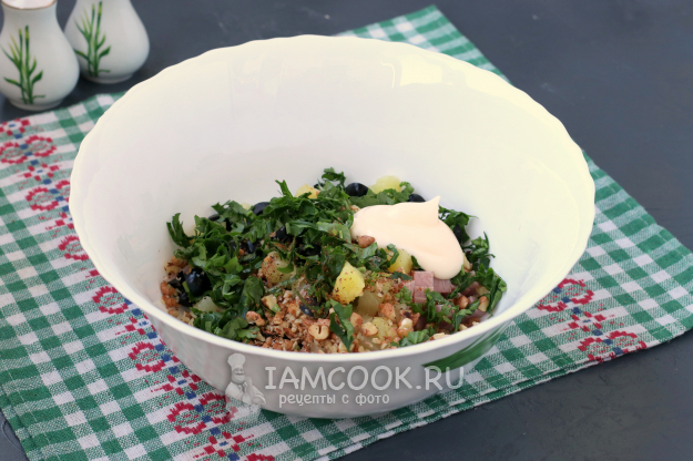 Сложить все ингредиенты в глубокую миску, посолить и поперчить. Добавить измельчённую петрушку и майонез.
