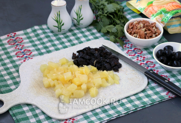 Измельчить чернослив и нарезать кубиками ананасы (такого же размера, как буженину).