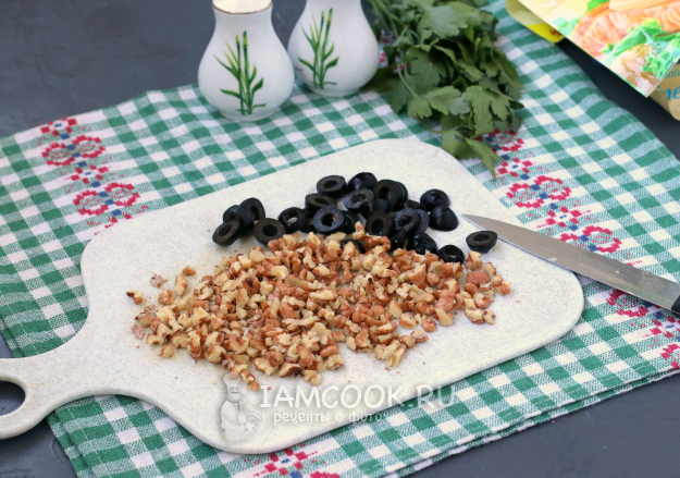 Колечками нарезать маслины, нарубить грецкие орехи.