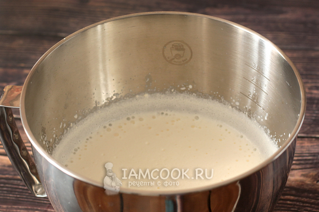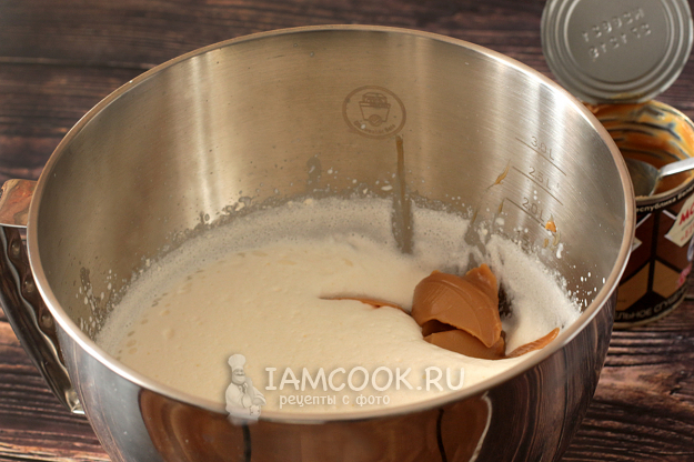 Взбейте сливки со сгущенкой до получения однородного и пышного крема.