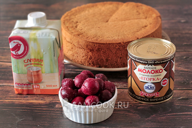 Сливки и вареная сгущенка должны быть одинаковой температуры, вишню можно не размораживать или слегка подтаять.