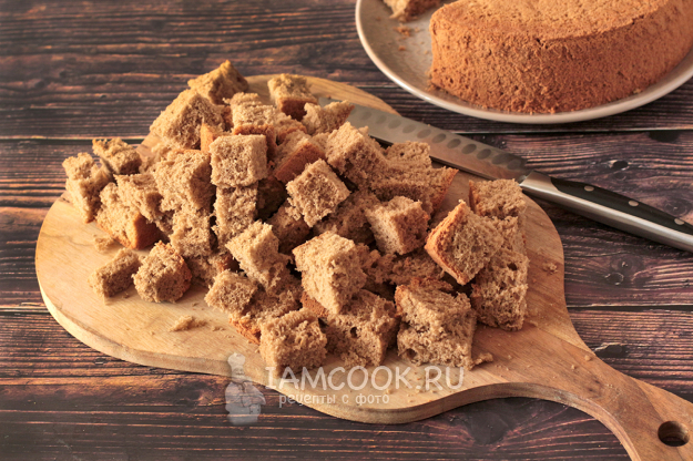 Бисквит нарежьте на кусочки, оставив неразрезанным нижний корж для подложки. Я не оставила нижний корж и собирать торт было сложнее.