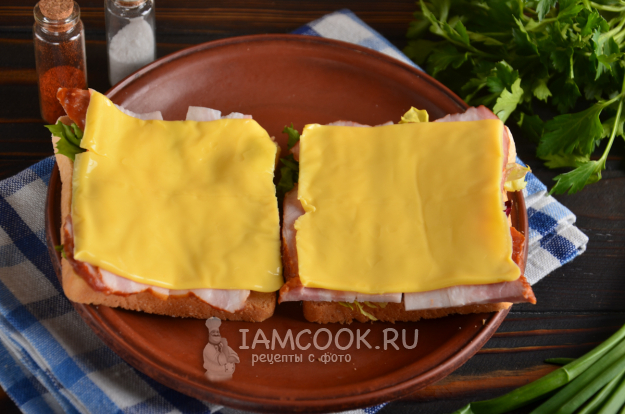 Сверху на грудинку нужно уложить пластинки мягкого сыра.
