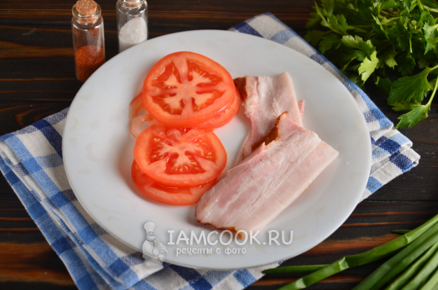 Копченую грудинку и свежие помидоры нужно нарезать тонкими ломтиками.