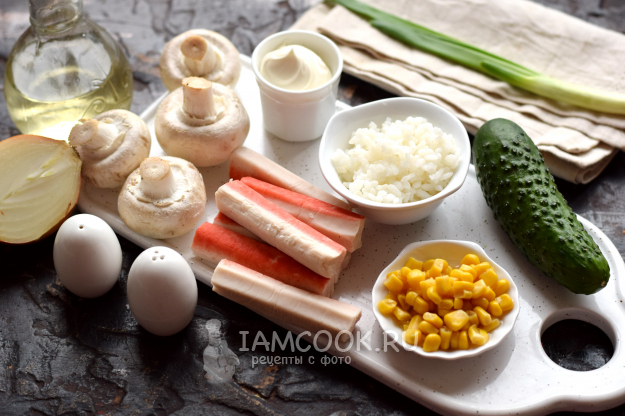 Подготовьте все необходимые продукты для салата с крабовыми палочками, грибами и кукурузой.