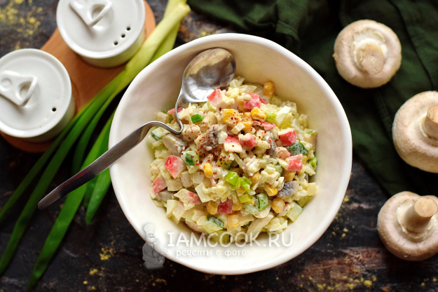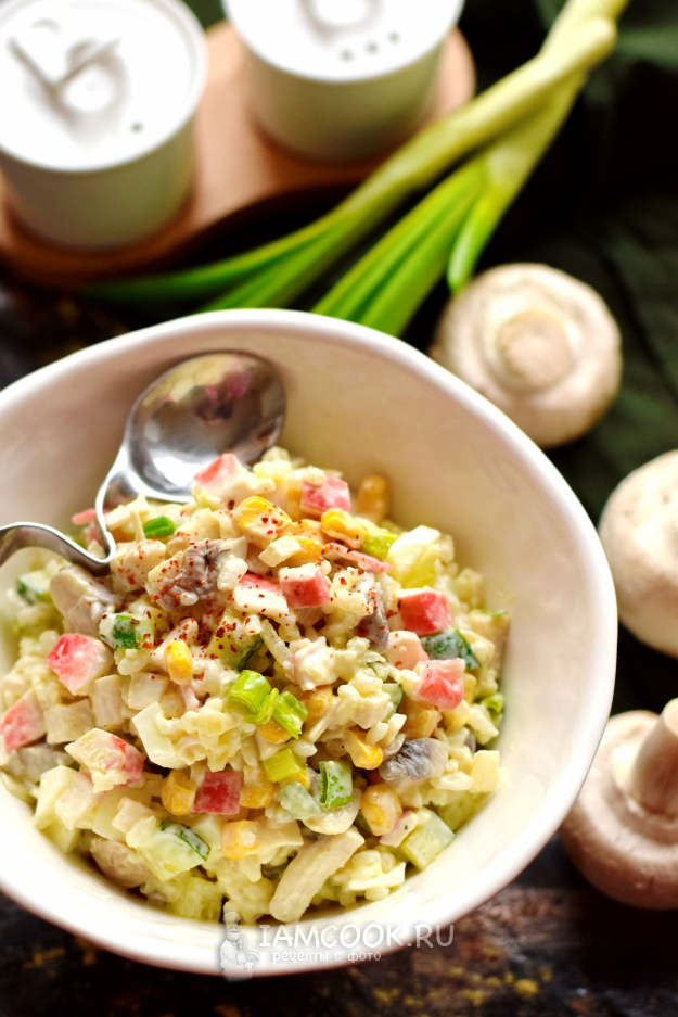 Салат с крабовыми палочками, грибами и консервированной кукурузой готов. Приятного аппетита!
