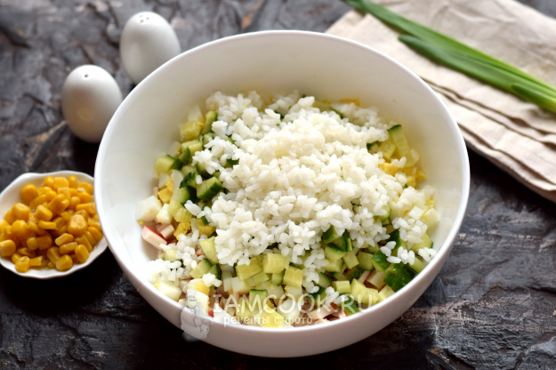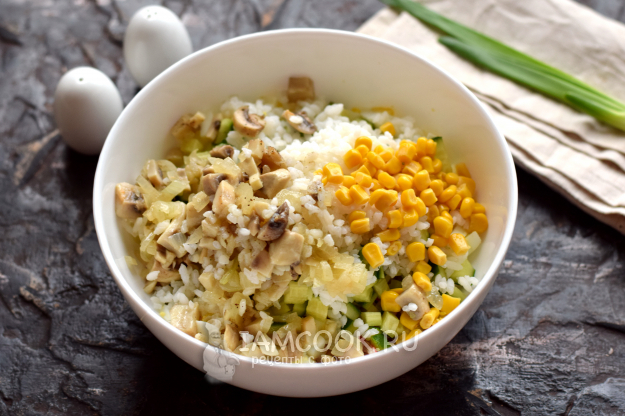Холодный вареный рис добавьте в основной состав.