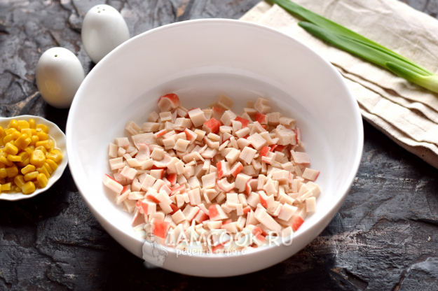 Крабовые палочки разморозьте, нарежьте кубиком, сгрузите в глубокую емкость для приготовления салата.