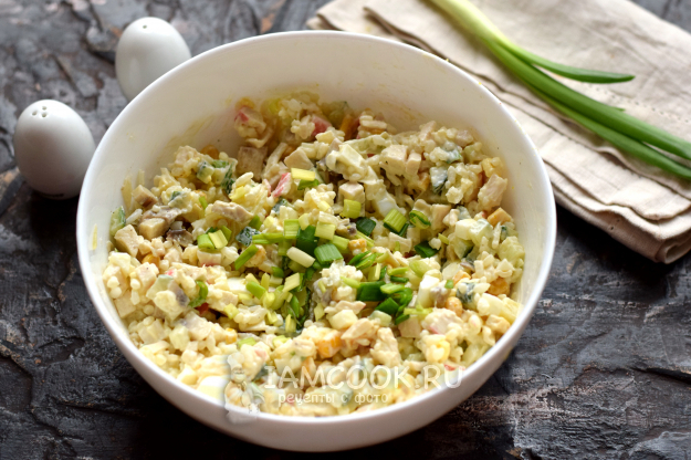В конце закиньте шинковку зеленого лука. Смесь заправьте майонезом, присыпьте солью по вкусу, тщательно перемешайте.