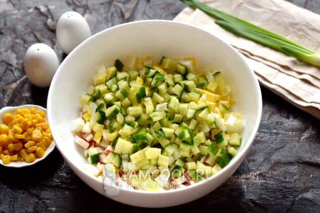 Яйца отварите «вкрутую», очистите, нарежьте кубиком. Свежий огурец также нарубите небольшими кубиками. Подготовленные компоненты сгрузите в миску.