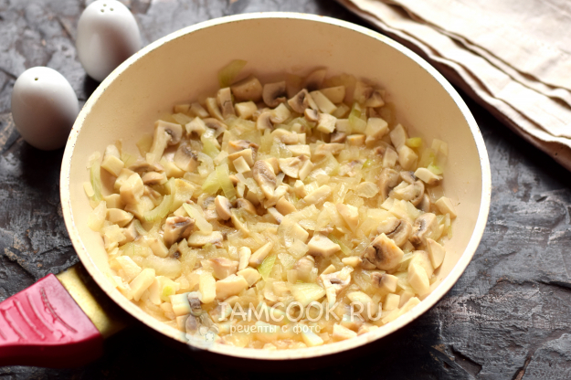 В первую очередь подготовьте грибы. Лук нарежьте кубиками, грибы — брусочками. Грибы обжарьте вместе с луком в масле примерно 5 минут, посолите по вкусу. Весь грибной сок должен выпариться.