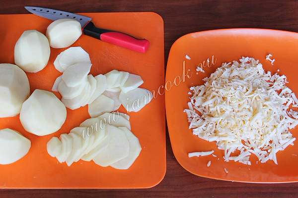 Натрите сыр, картофель нарежьте тонкими кружочками.