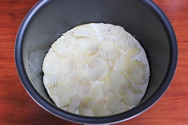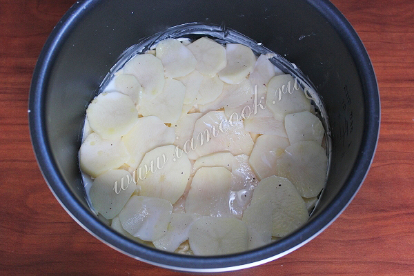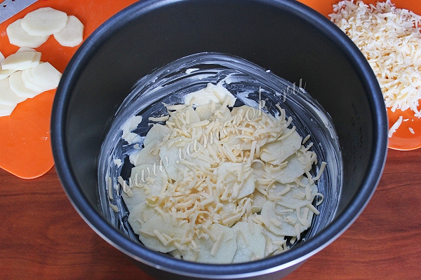 Дно чаши мультиварки смажьте половиной сливочного масла. Укладывайте картофель слоями, пересыпая их сыром.