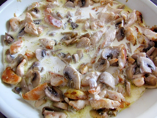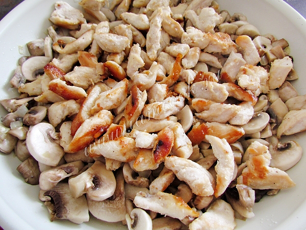 В сковороду с грибами переложите обжаренное куриное филе, перемешайте, накройте крышкой и тушите на маленьком огне 3-4 минуты.